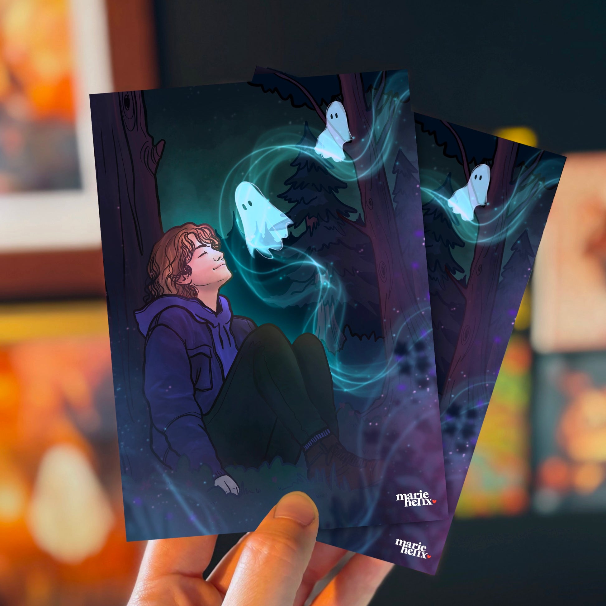 Plongez dans une atmosphère douce et mystérieuse avec cette illustration où la fraîcheur nocturne prend vie. Un personnage apaisé, entouré de gentils fantômes lumineux, savoure la magie d’un souffle, frais et tendre à la fois. Une scène poétique, qui évoque sérénité et enchantement automnal.